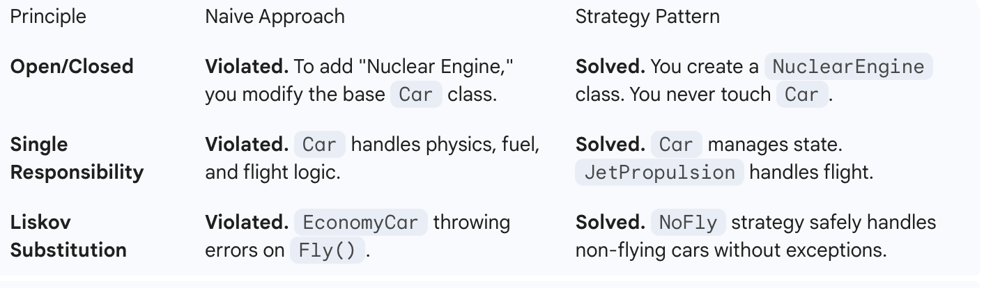 In this deep dive, we are going to look at a common scenarioâbuilding a car manufacturing system. We will see how a naive approach traps us in a web of dependencies (The âGod Classâ), and how the Strategy Pattern acts as a âPlugin Systemâ to restore sanity, testability, and flexibility.