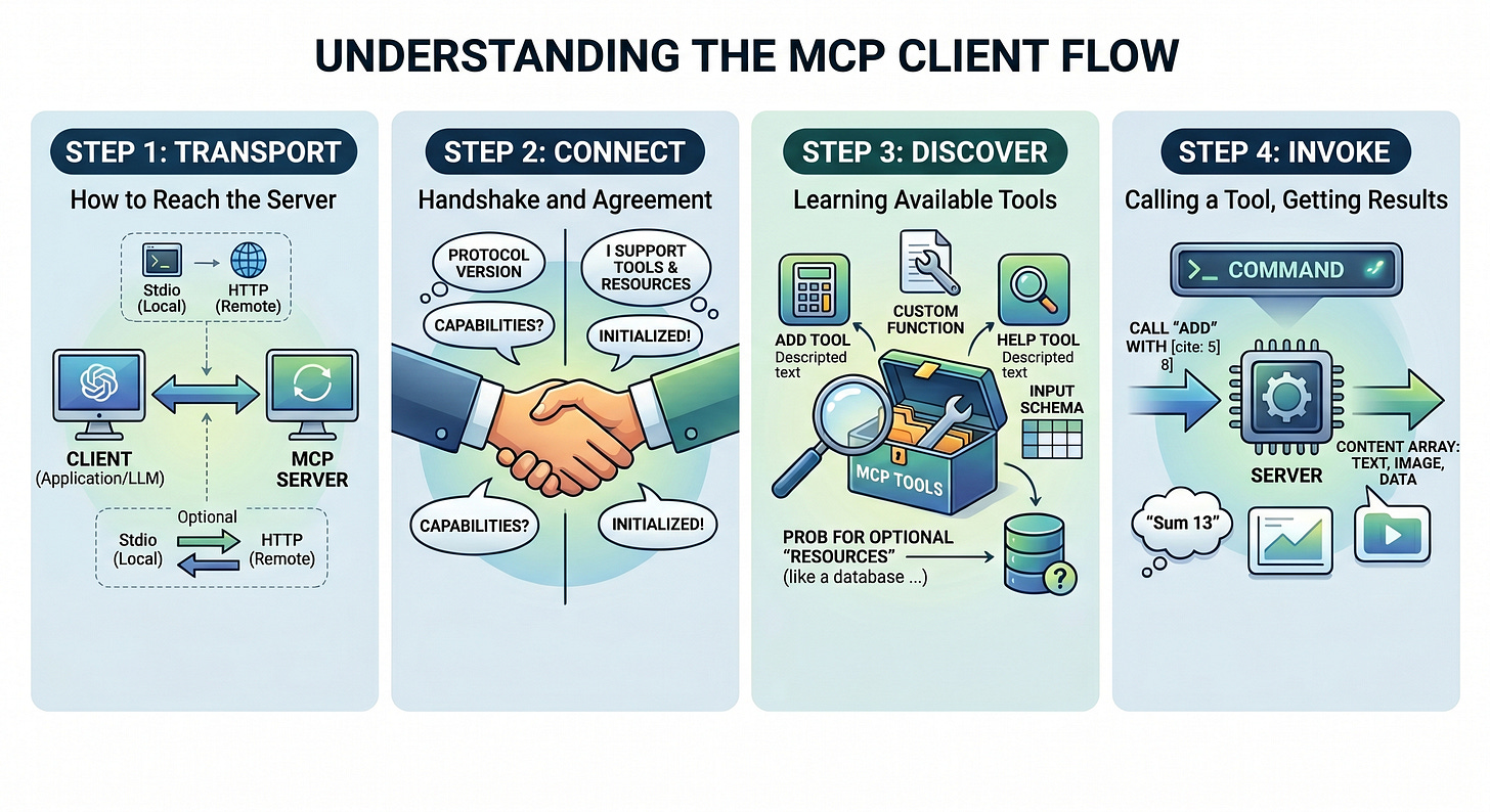 A high-level walkthrough of how a Model Context Protocol (MCP) client connects to a server, discovers tools, and invokes them — using a small .NET 10 console app