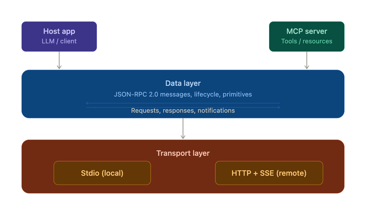 MCP's architecture is elegantly simple. The entire protocol is split into exactly two layers, each with a clearly defined responsibility. If you've ever worked with the OSI model or even just the separation between ASP.NET's middleware pipeline (how requests are processed) and Kestrel (how bytes move over the wire), this pattern will feel immediately familiar.