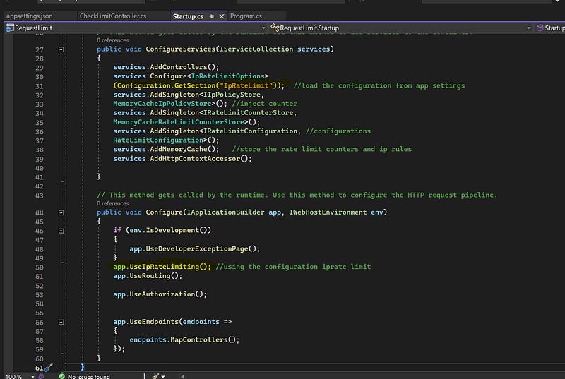 The good thing about the .Net core is that the rate limiter middleware service is available in the Framework, configure this in the startup.cs file like the below :