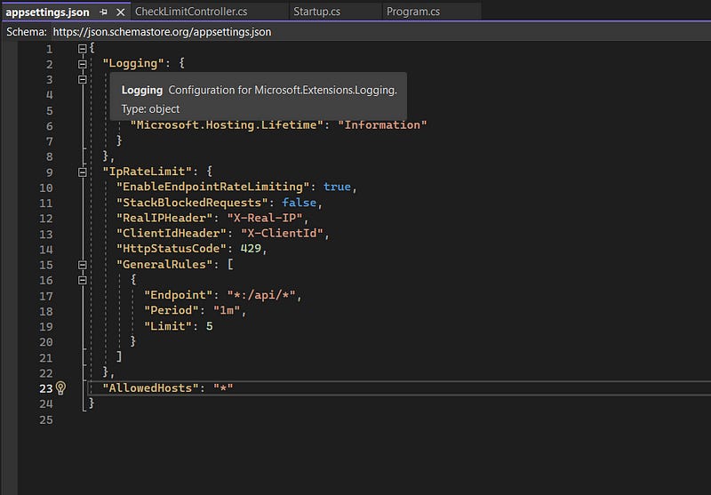 Create a .Net core API and configure the Rate Limiter setting in the appsettings.json file like below :