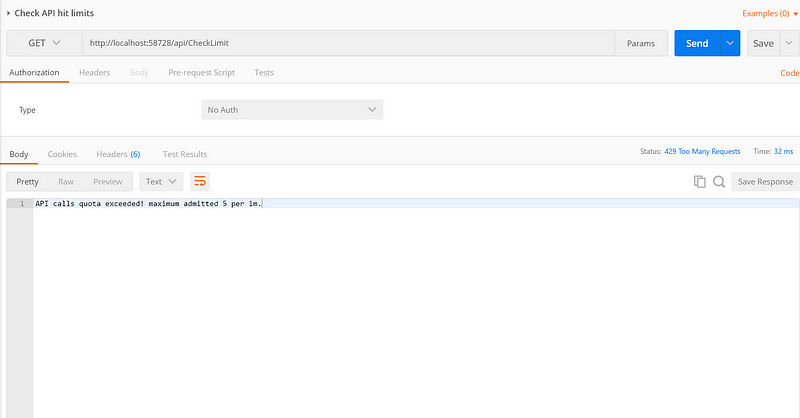 Now, run the project locally and test this API call from the Postman tool, as you can see I have set the Rate limiter to number 5, it means the API request is allowed only 5 times after that it will throw the error where its limit is reached. The response 429 is thrown which means “Too Many Requests”