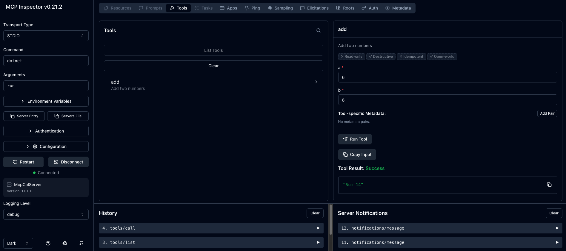 4. The server routes the request to the matching method (`CalculatorTool.Add`), executes it, and returns the result.