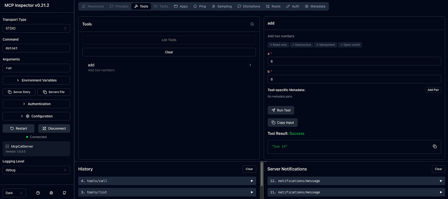 MCP provides an Inspector tool that lets you interact with your server directly — without needing a full AI host application. It’s invaluable for development and debugging.